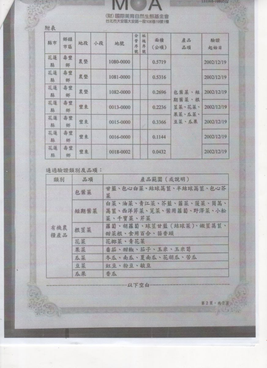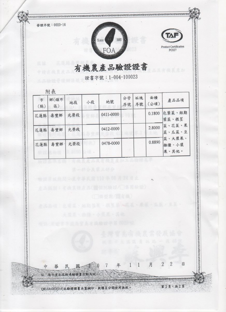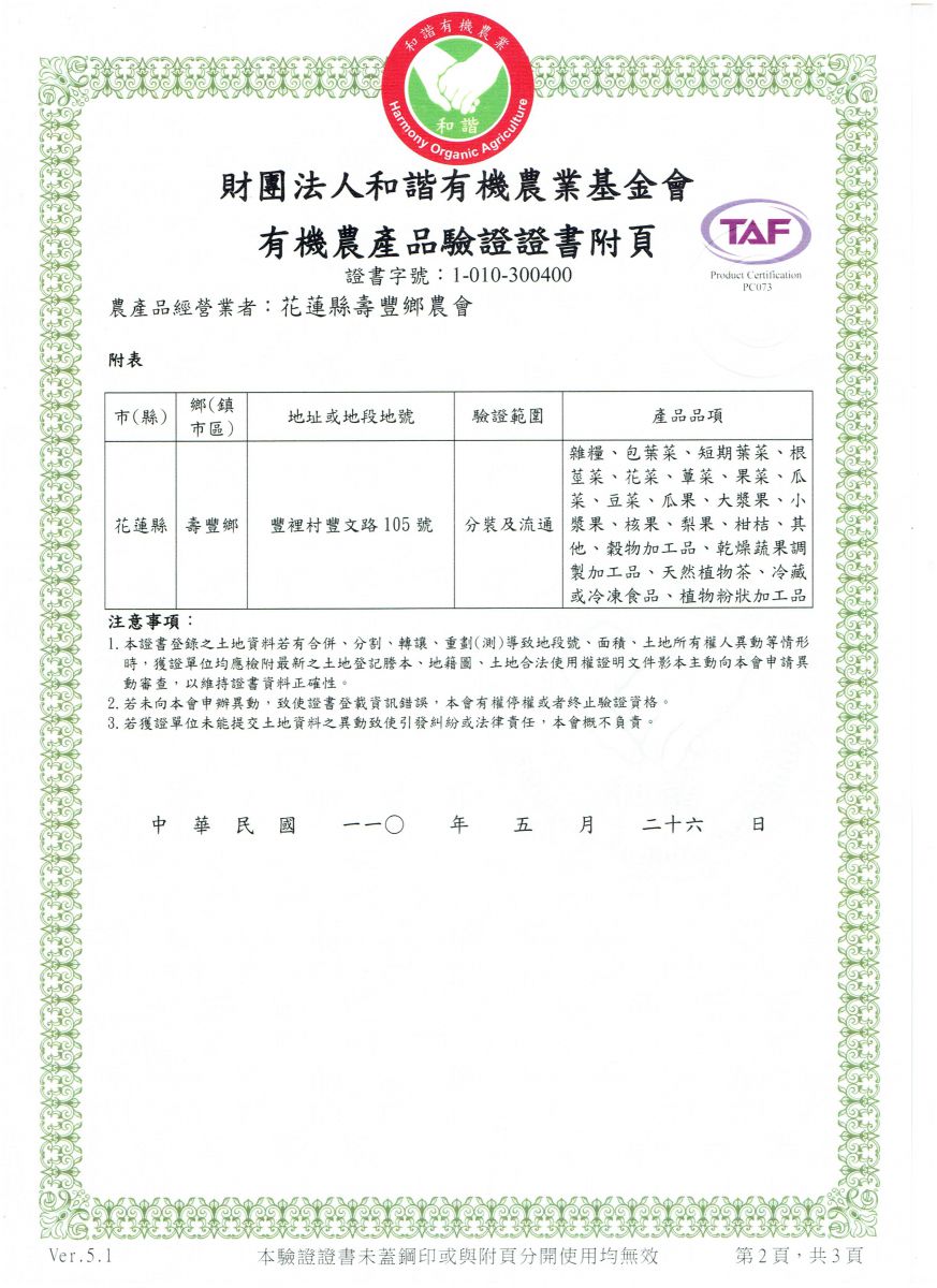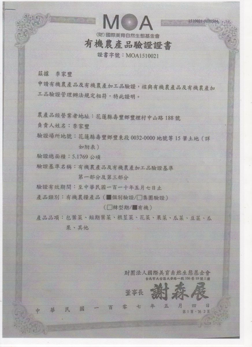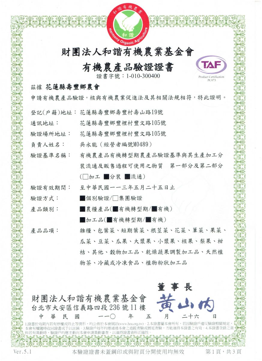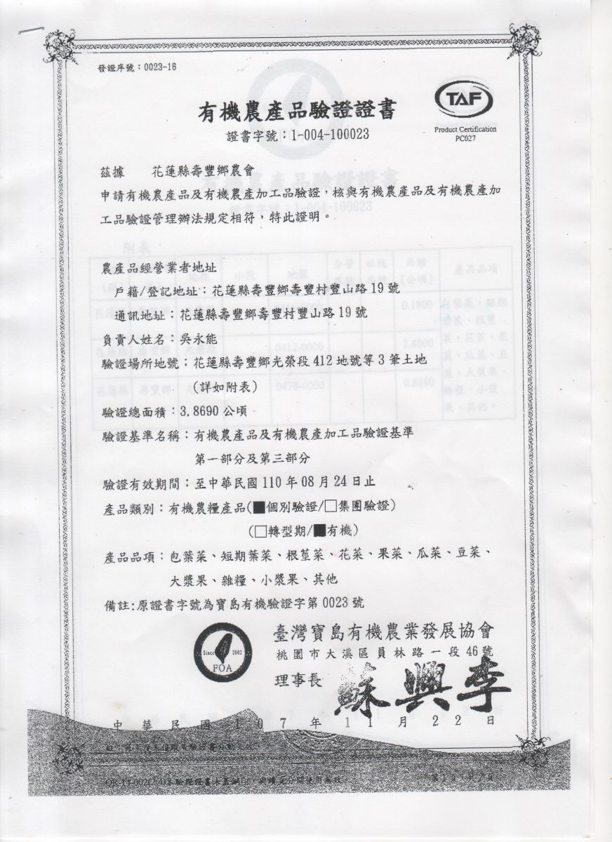 | 花蓮縣壽豐鄉農會(有機農產品分裝、流通) | 證書1證書2證書3 |