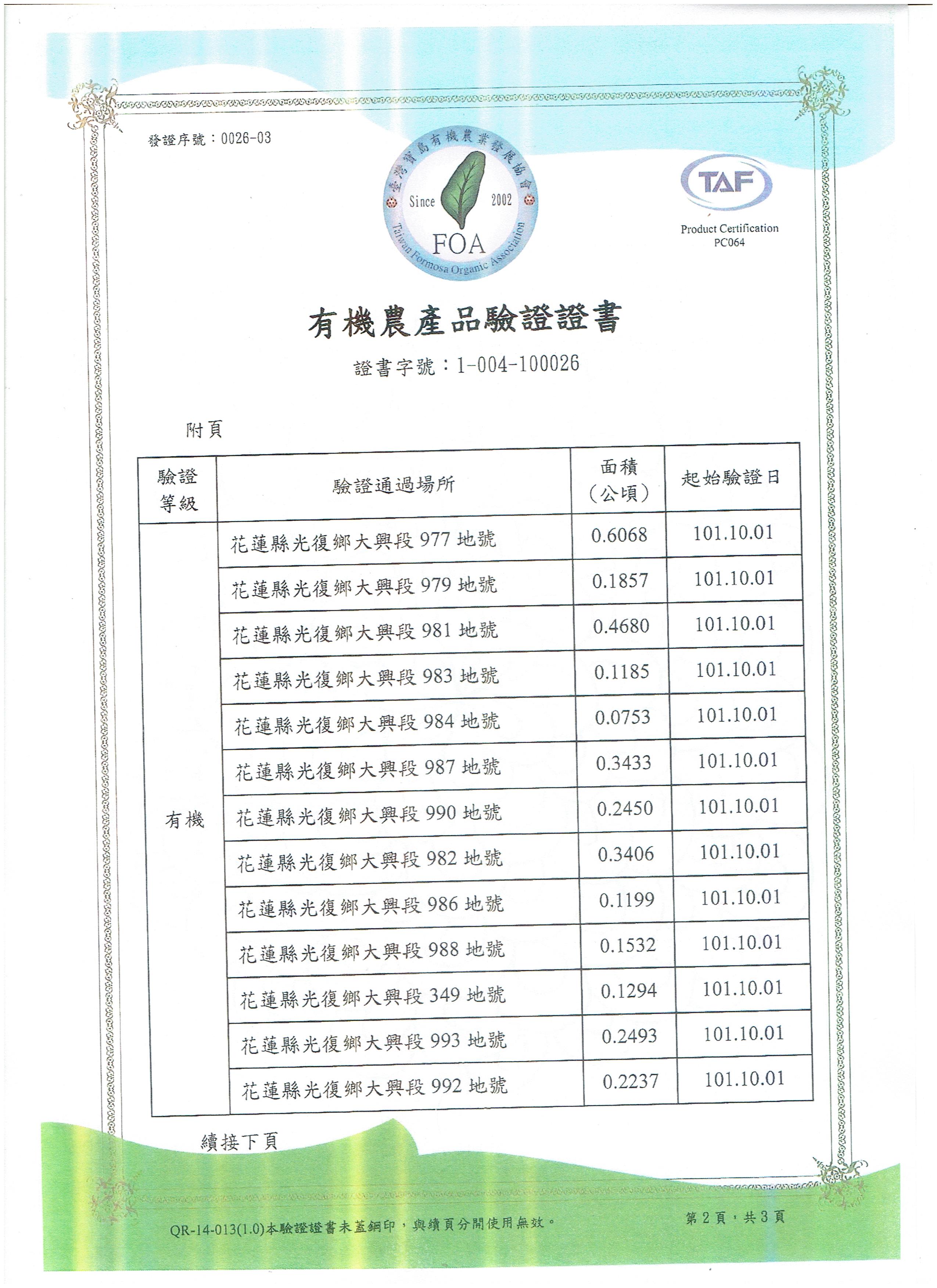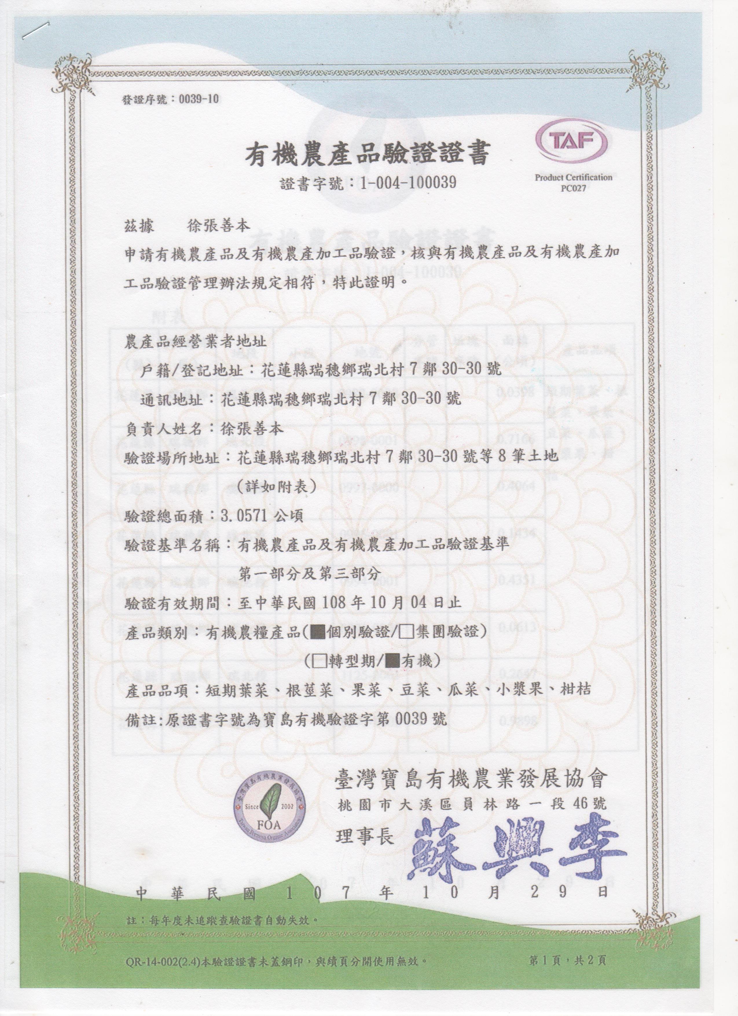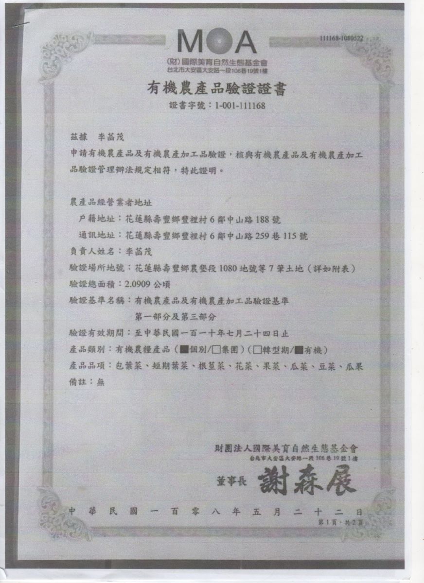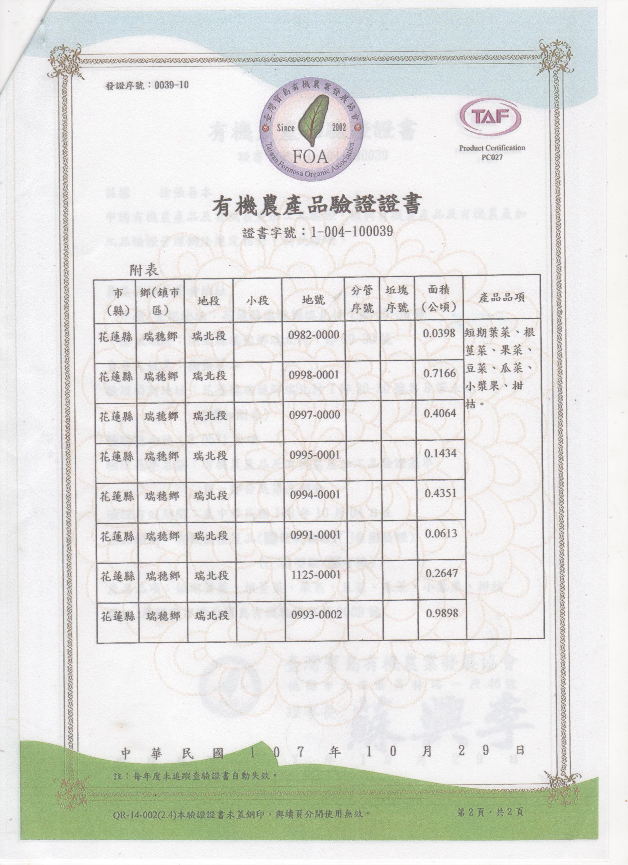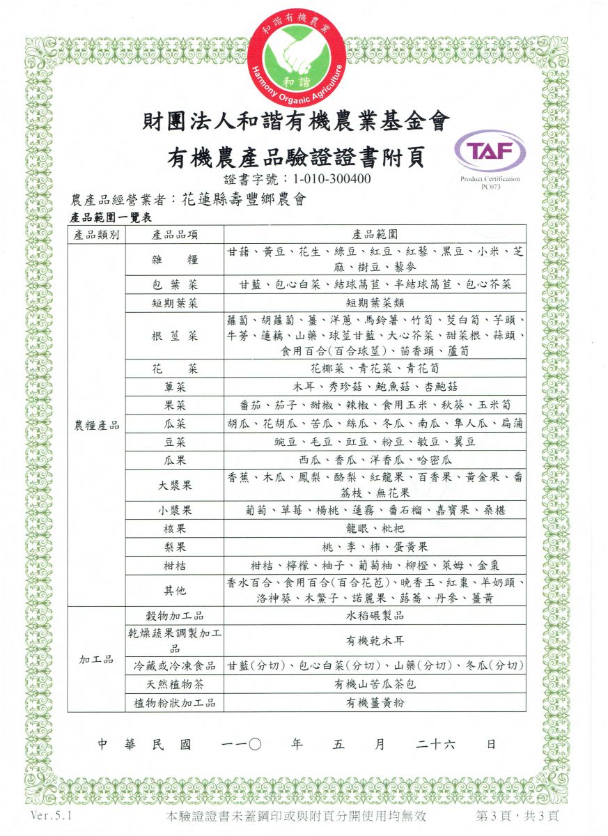| 花蓮縣壽豐鄉農會(有機農產品分裝、流通) | 證書1證書2證書3 |