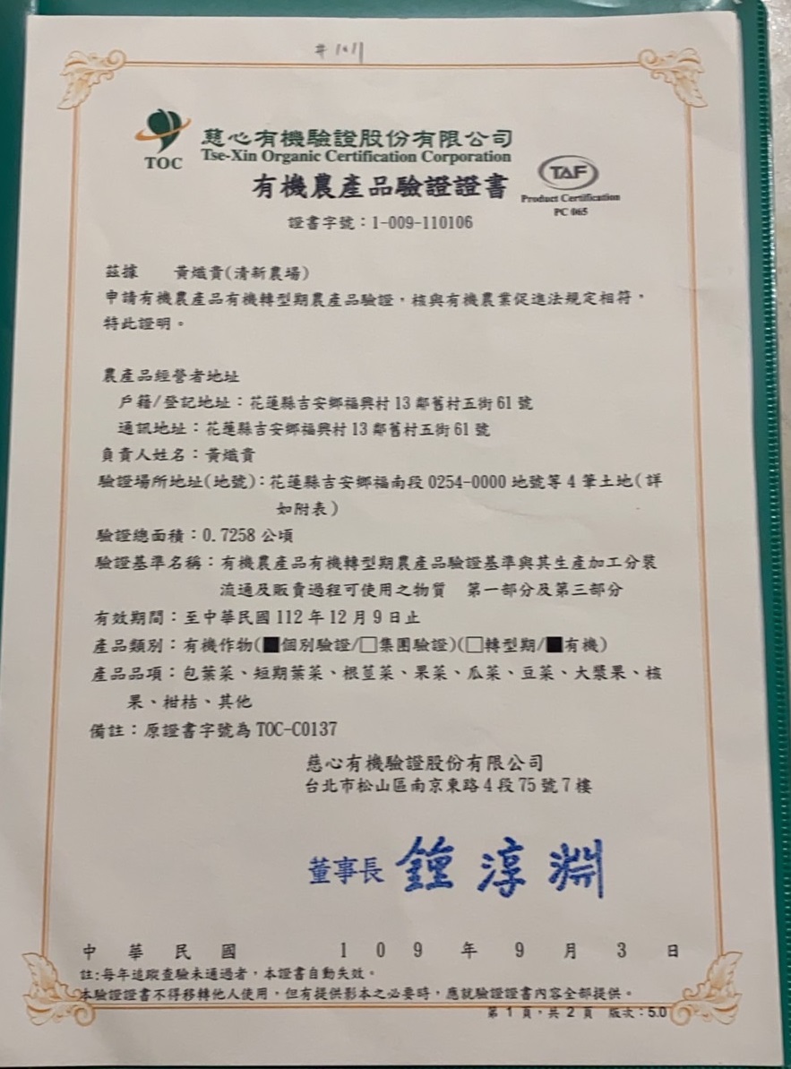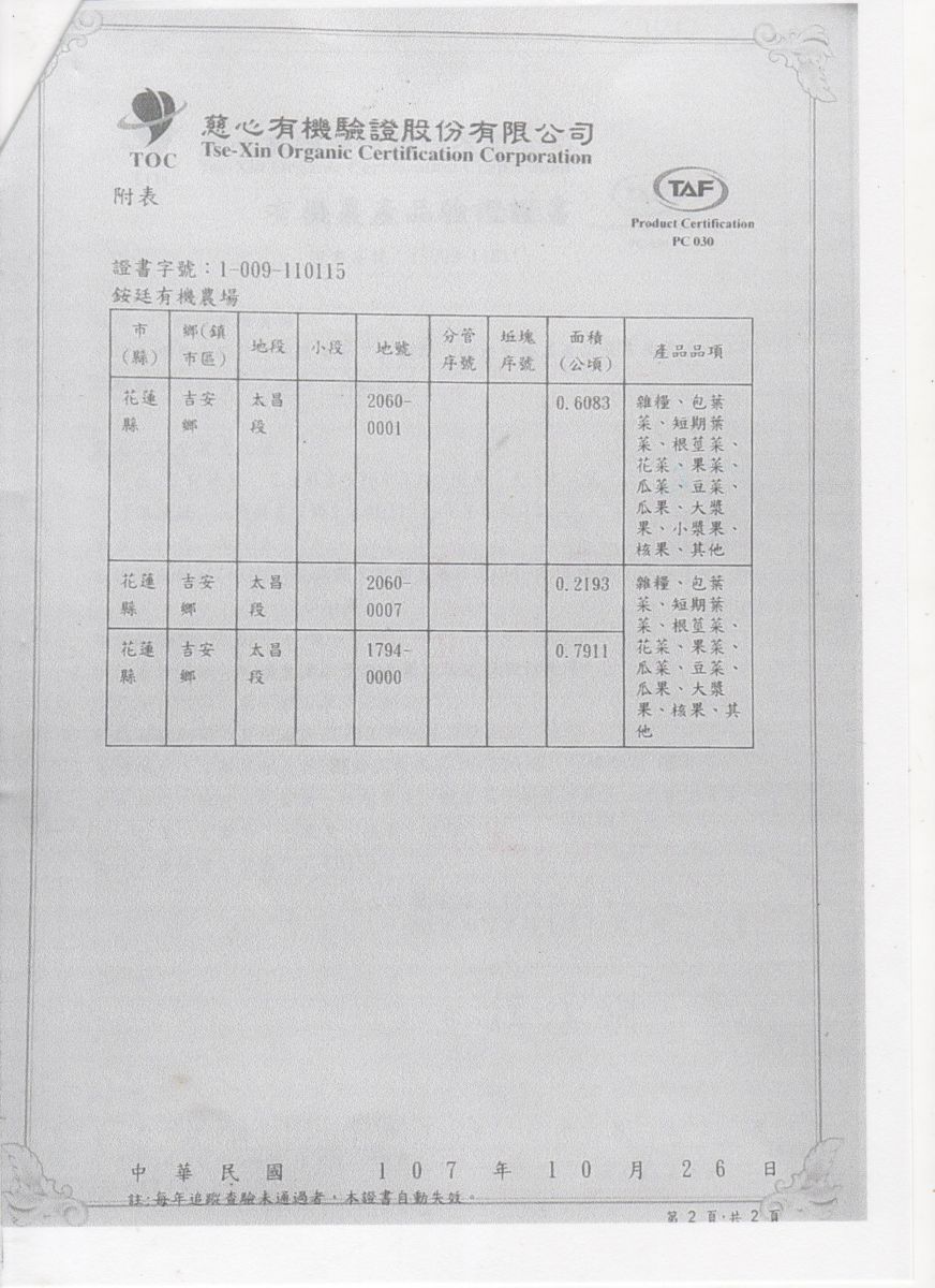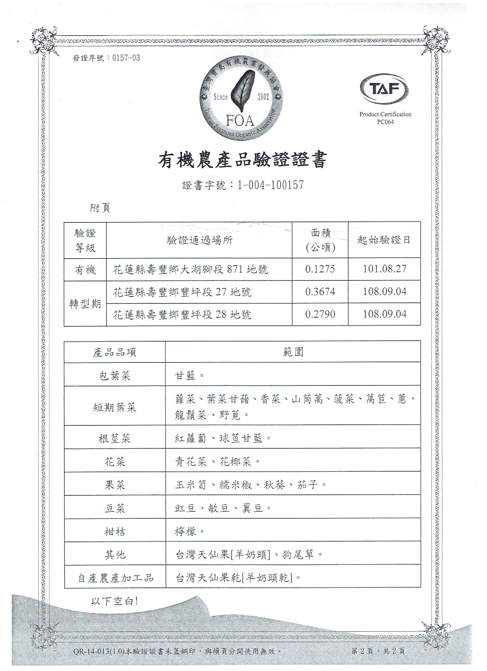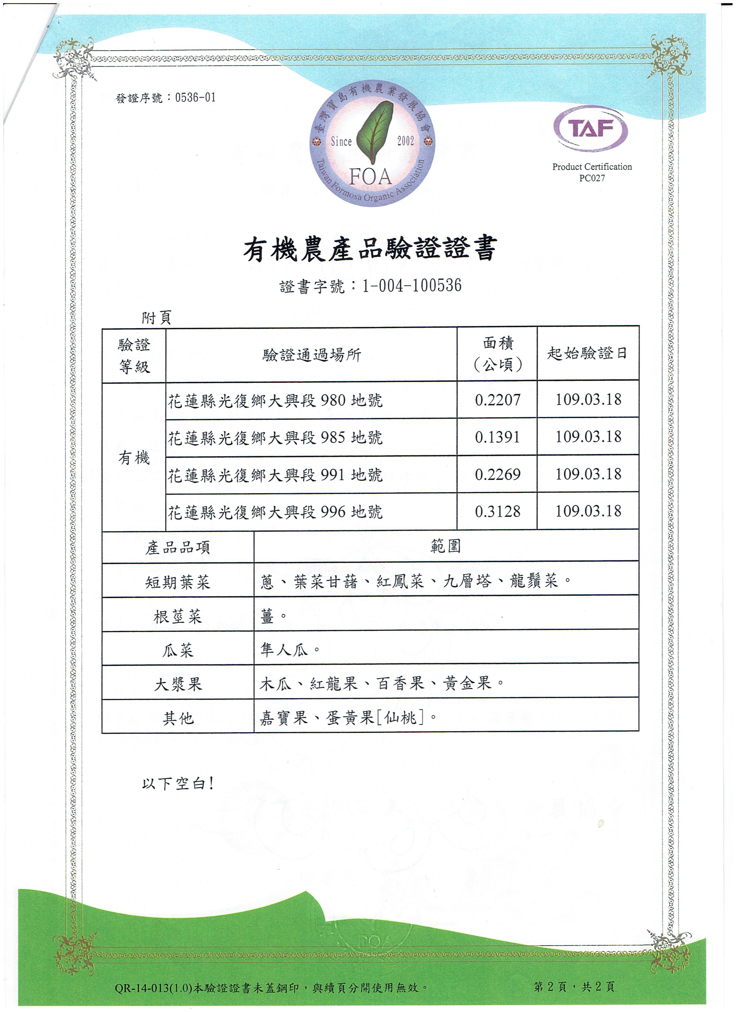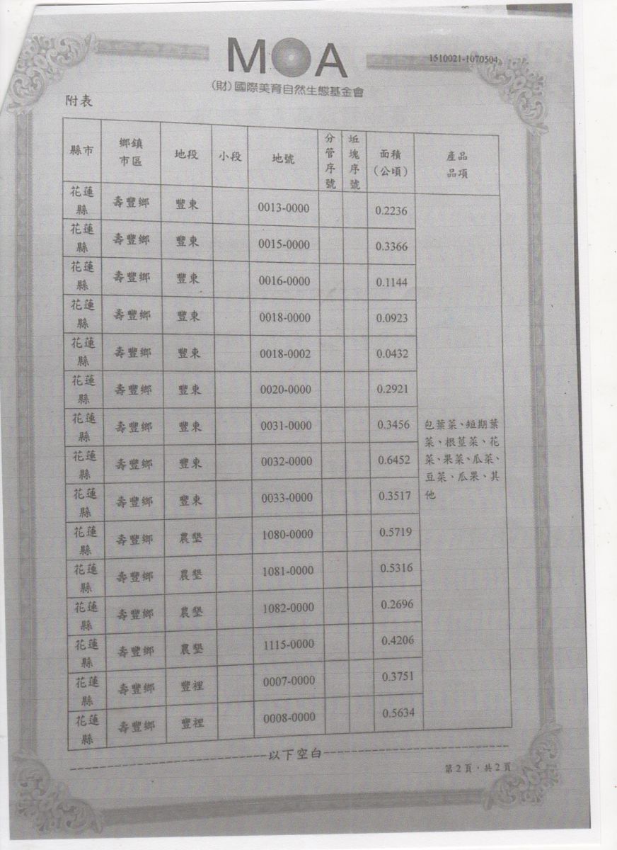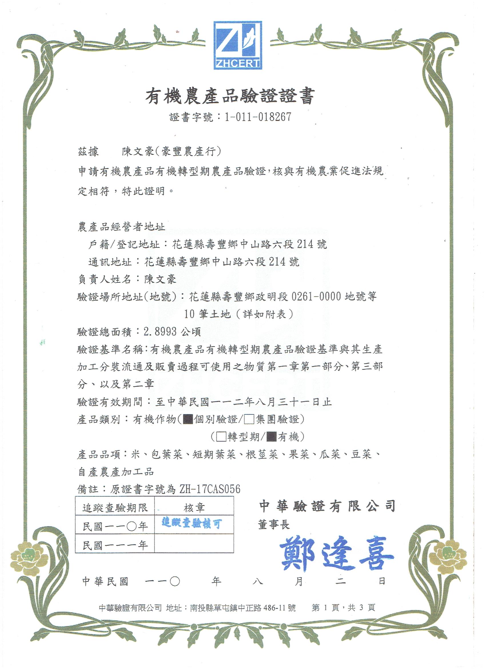 | 花蓮縣壽豐鄉農會(有機農產品分裝、流通) | 證書1證書2證書3 |