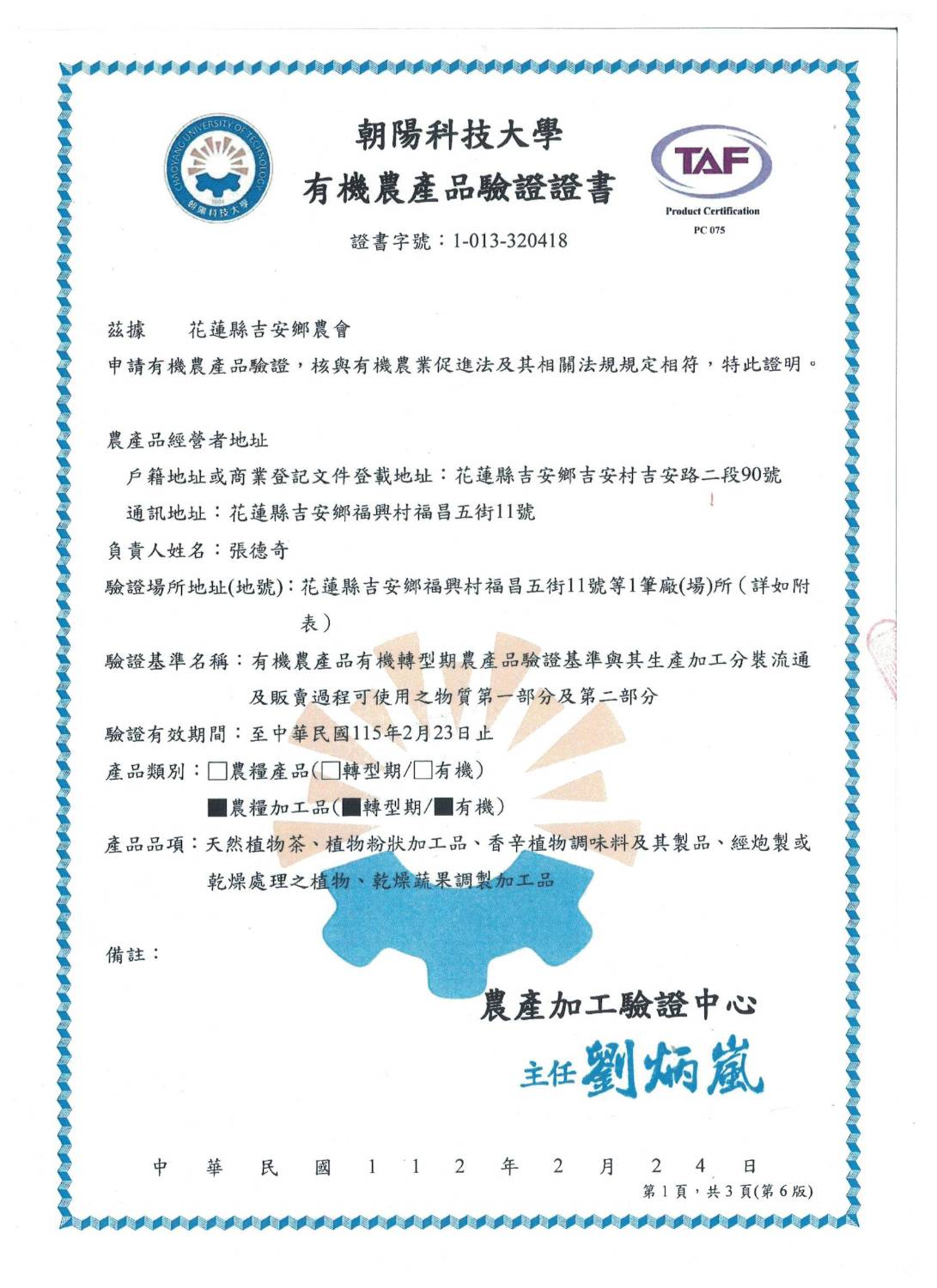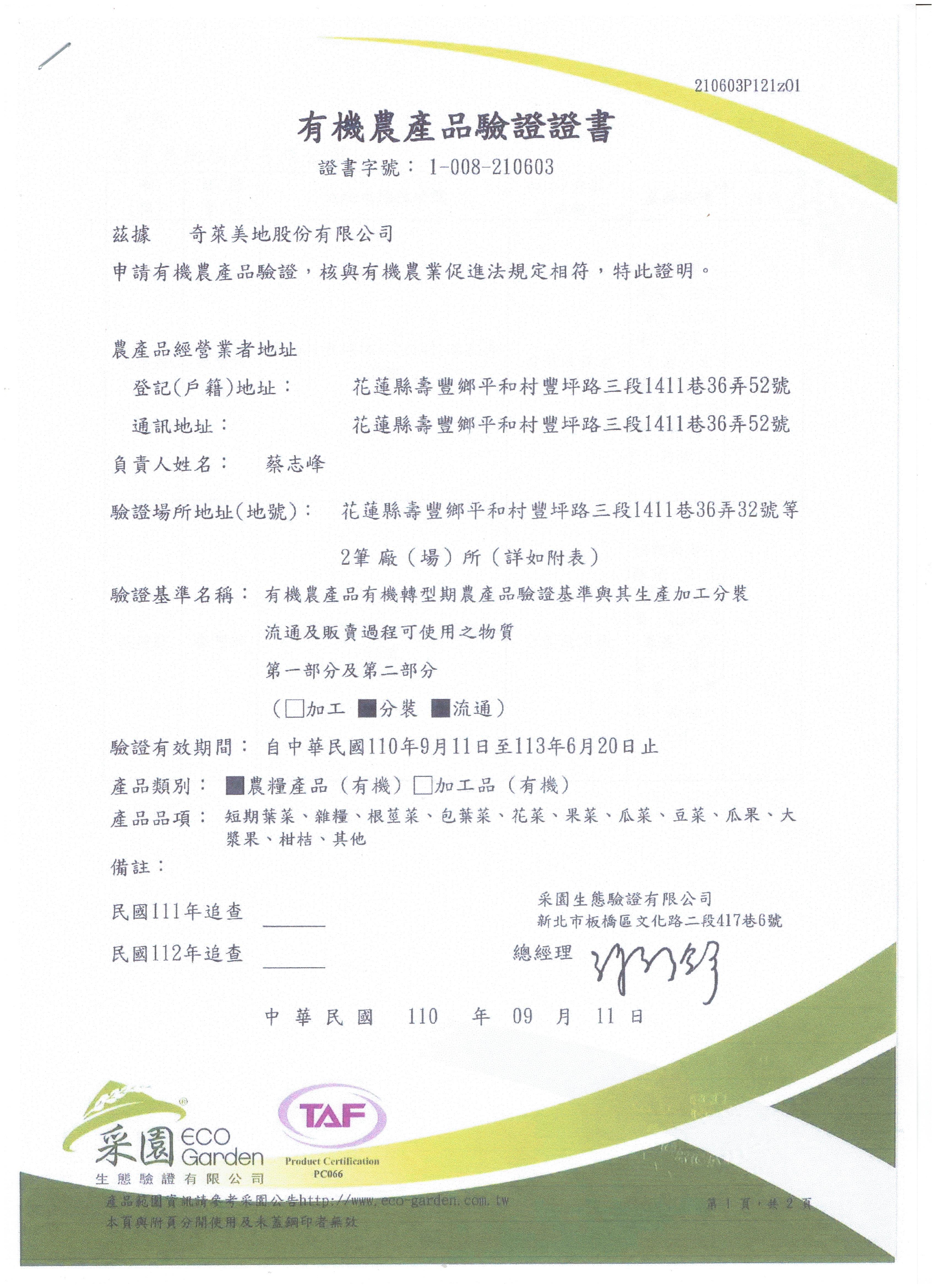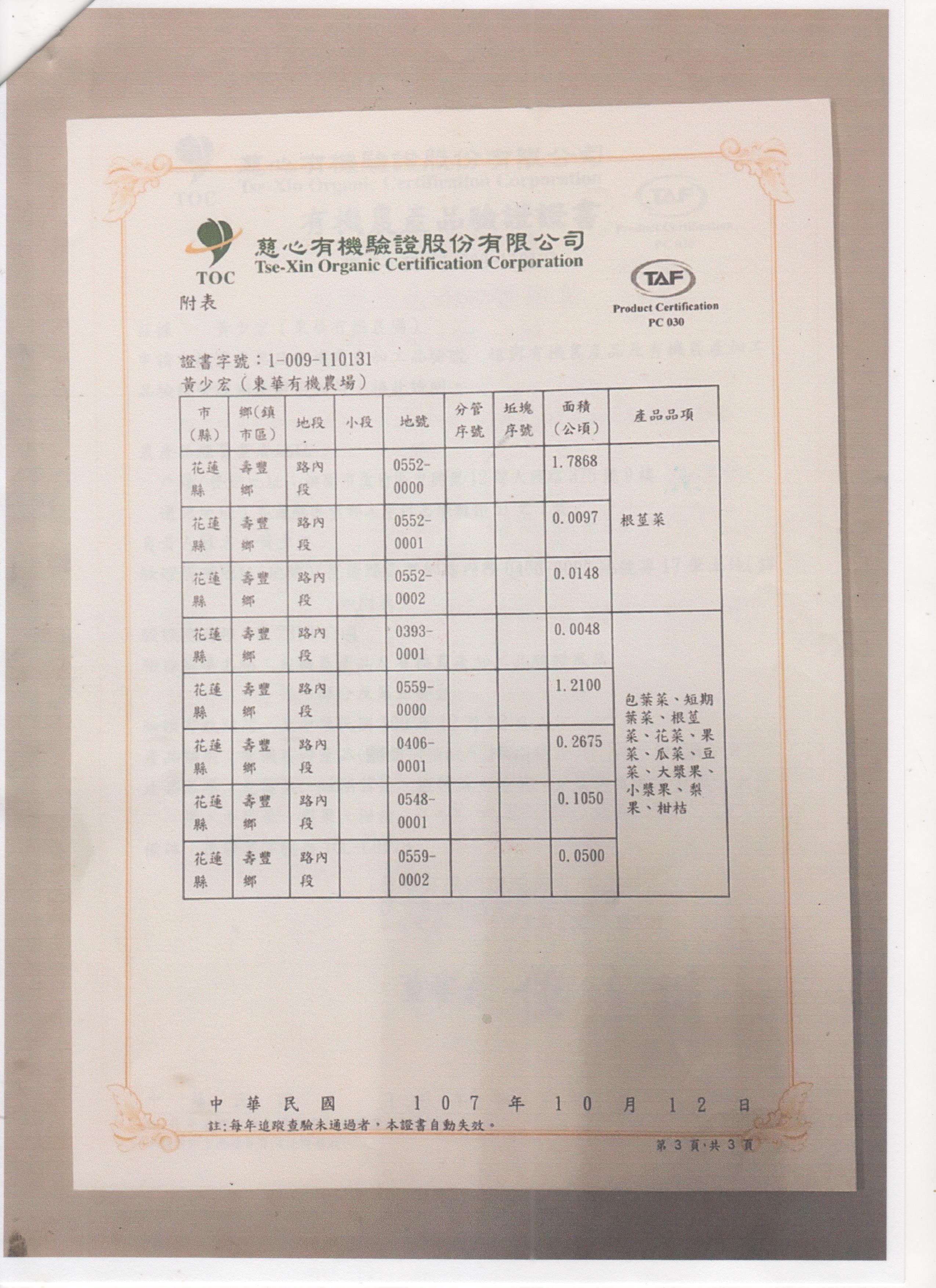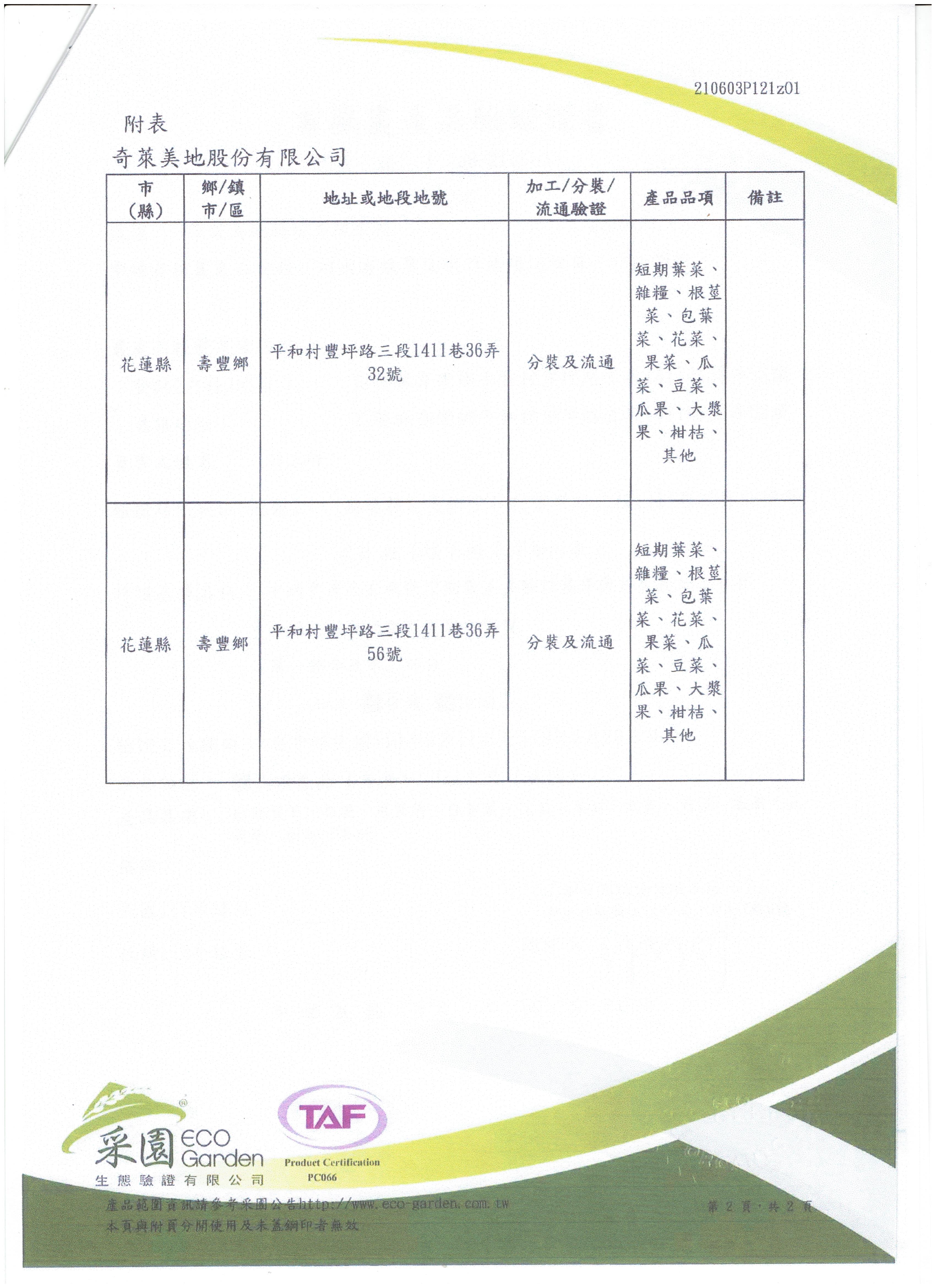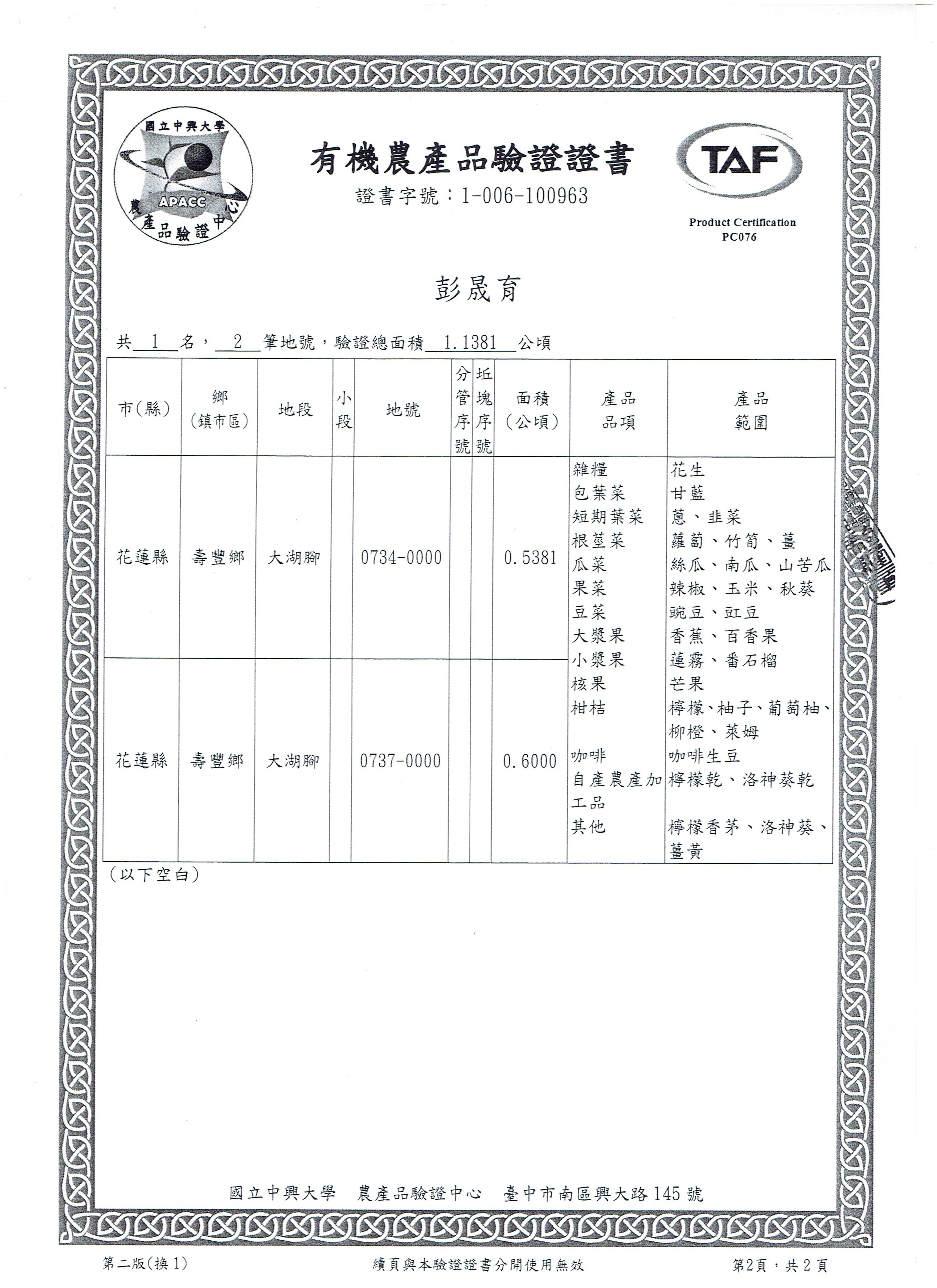 | 花蓮縣壽豐鄉農會(有機農產品分裝、流通) | 證書1證書2證書3 |