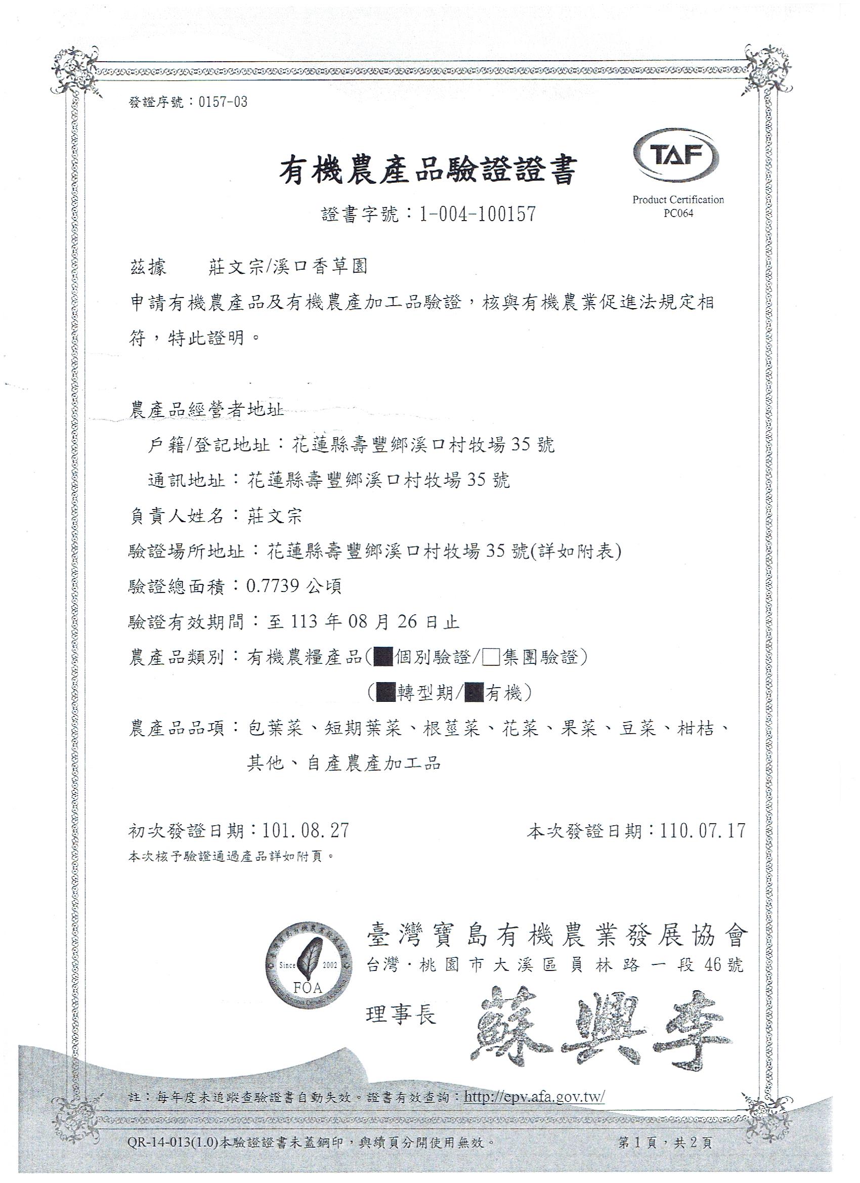 | 莊文宗/溪口香草園 | 證書1證書2 |