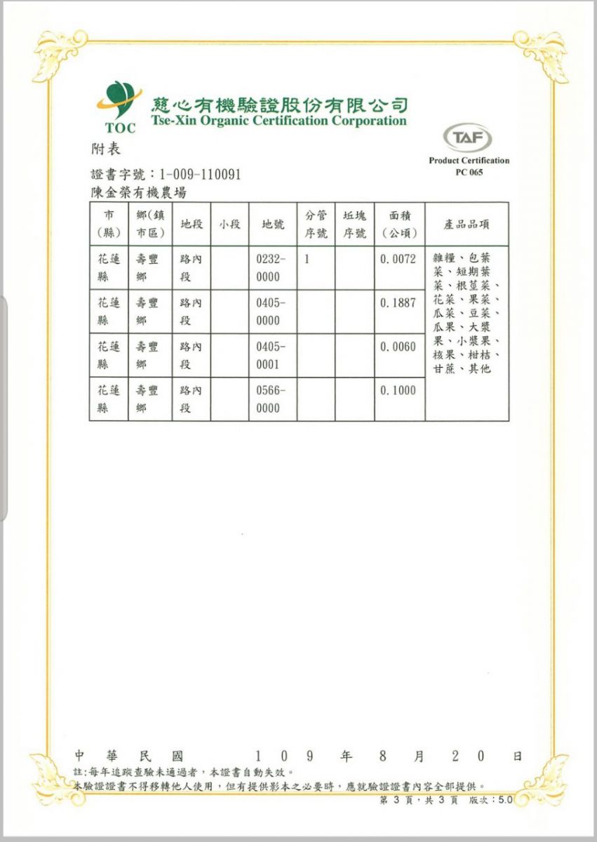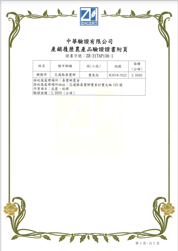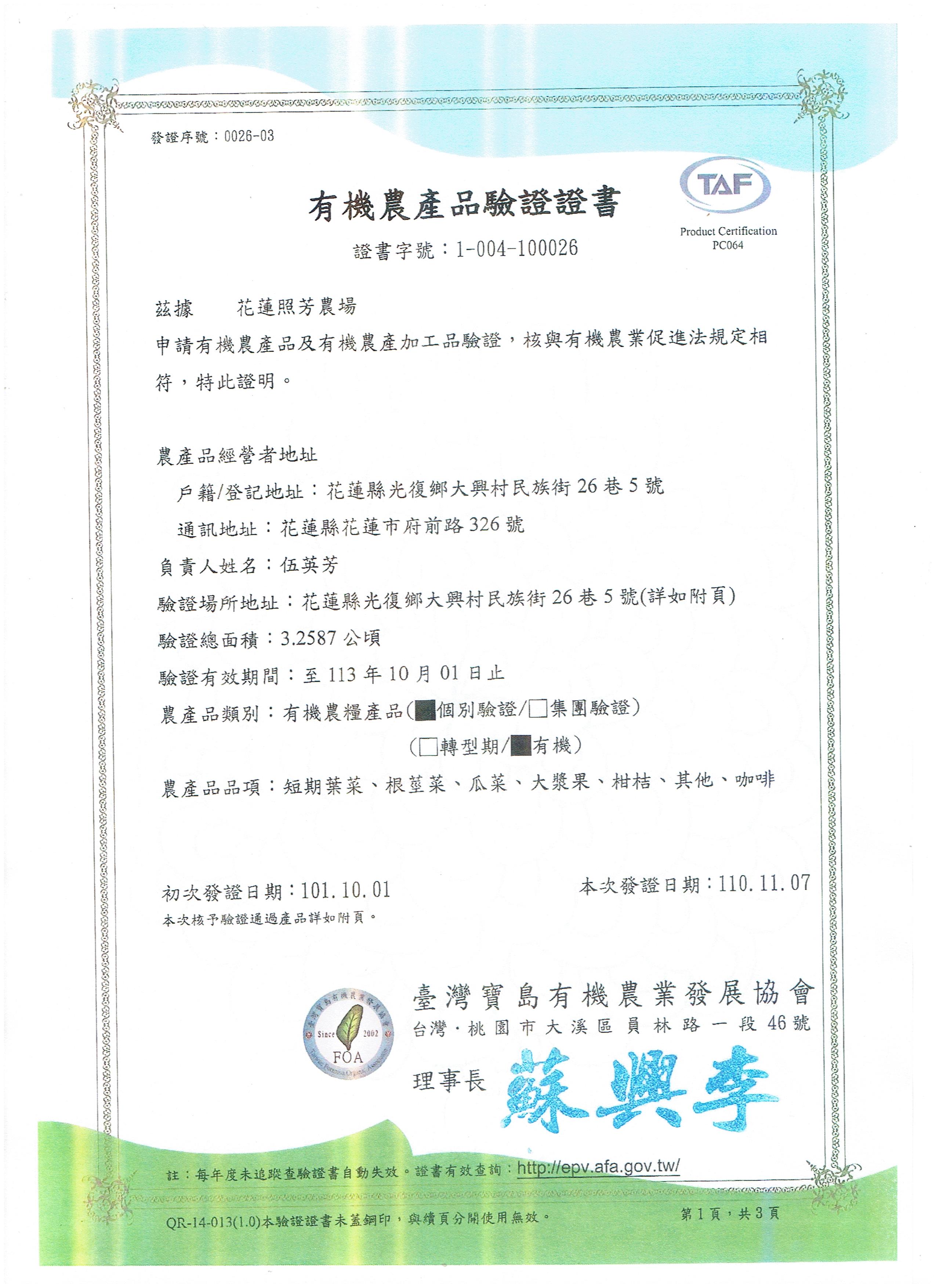 | 花蓮照芳農場 | 證書1證書2證書3 |