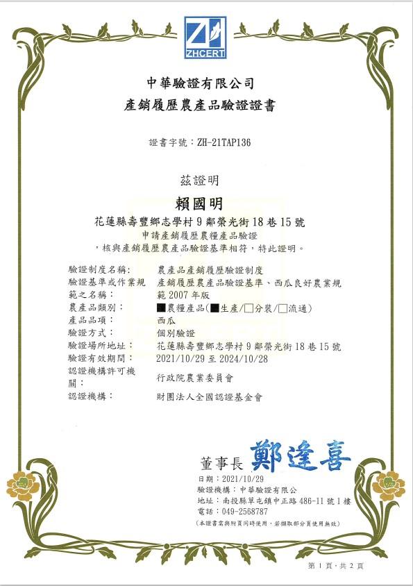| 賴國明(西瓜-產銷履歷) | 證書1證書2 |