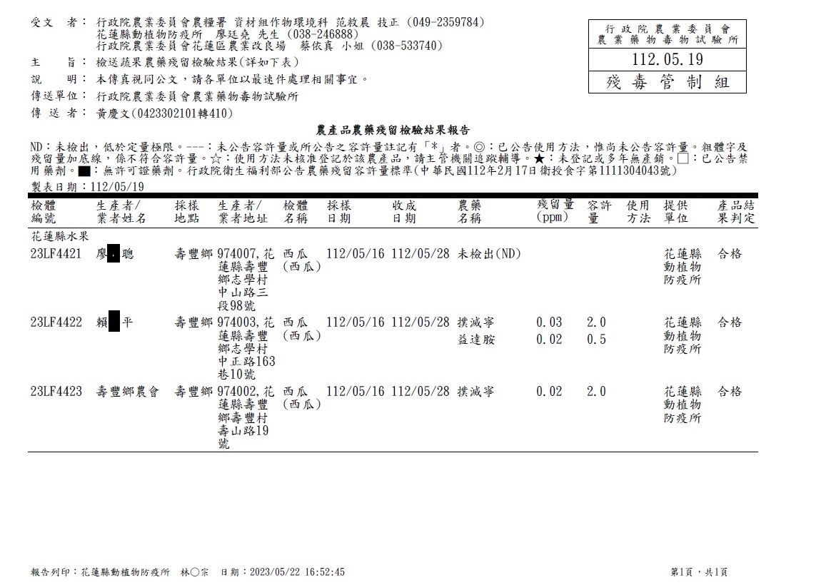 | 壽豐鄉農會(112年果艷西瓜農藥殘留檢驗報告)合格 | 證書1 |
