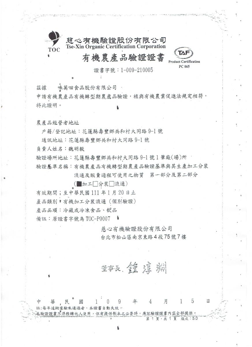 | 味萬田(有機加工驗證) | 證書1 |