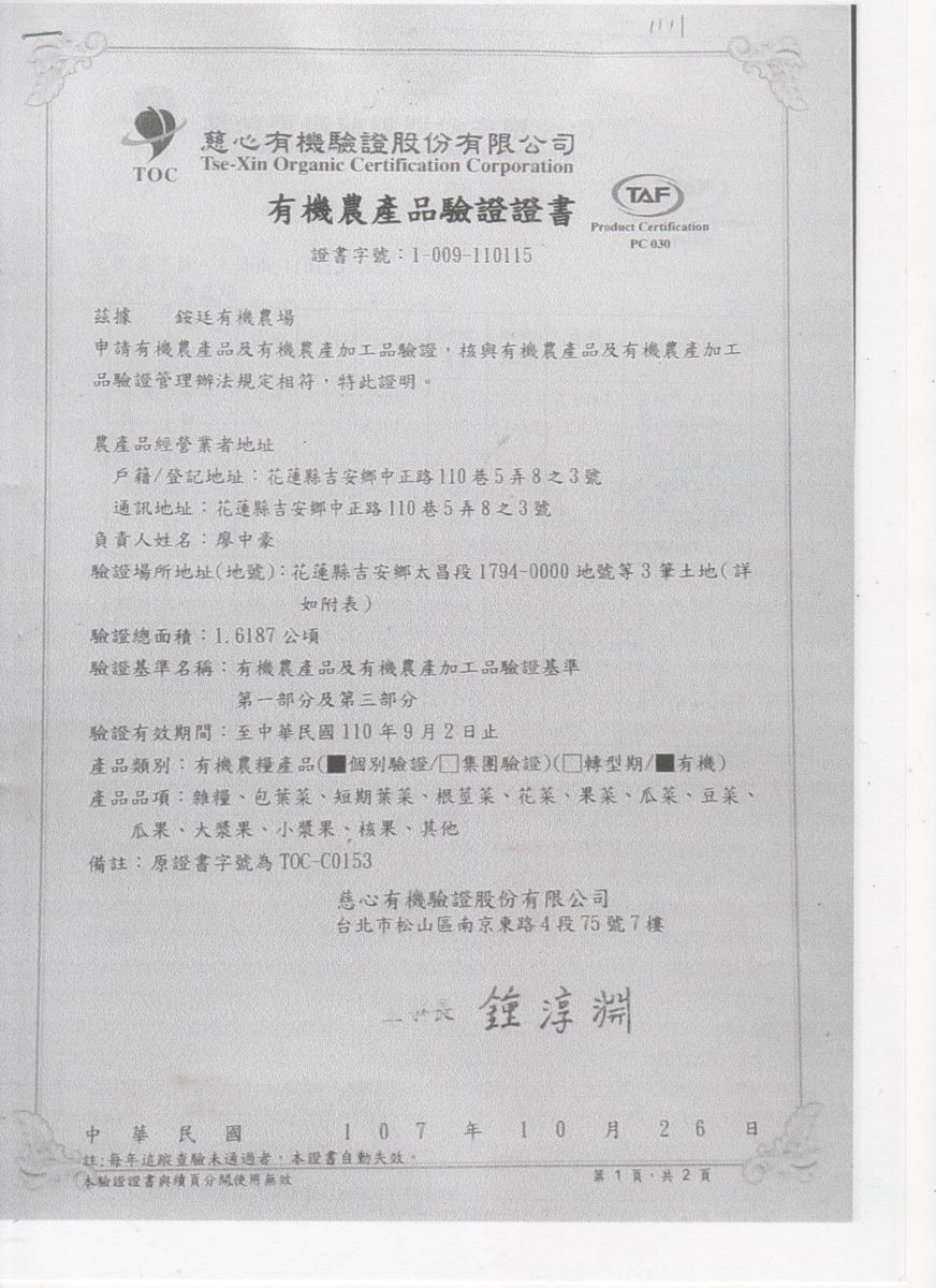 | 銨廷有機農場(廖中豪) | 證書1證書2 |