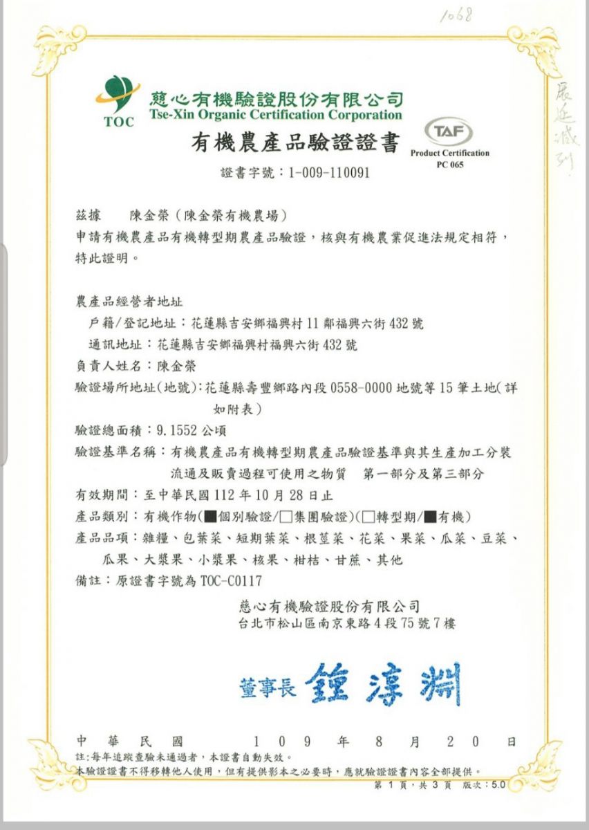| 花蓮縣吉安鄉農會(有機農產品生產、加工、分裝、流通) | 證書1證書2證書3 |